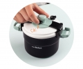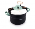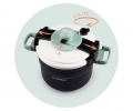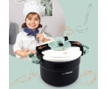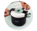 Věrná replika tlakového hrnce Tefal má ventil a odnímatelné víko. V černobílém provedení se zelenými úchytkami.