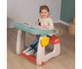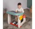 Psací stůl se zabudovanou lavicí, psací plochou pro psaní stíratelným fixem a opěrkou na nohy. Psací plocha je lehce nakloněna pro lepší psaní nebo malování.