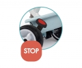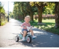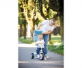 Kovový rám, tichá kolečka, řídící tyč s taškou, stříška proti sluníčku, opěrka hlavy, ochranný rám, brzda, klakson, opěrky nohou. Certifikováno EN 1888-1 pro kočárky. Rozměry: 68x101x52 cm.