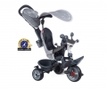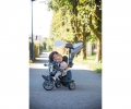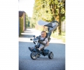 Multifunkční šlapací tříkolka s kovoým rámem, se stříškou proti sluníčku s UV ochranou v šedivém provedení vhodná pro chlapečky i holčičky. Intuitivní řízení pomocí nastavitelné a odnímatelné rodičovské vodící tyče. Nastavitelné sedadlo ve 3 směrech s opěrkou hlavy, s omyvatelným textilním potahem, odnímatelný bezpečnostní ochranný rám a pásy, volant s klaksonem a zpětnými zrcátky, sklopné odnímatelné stupačky na nožičky. Tichá, bezúdržbová a protiskluzová komfortní kolečka Whisper. Možnost zablokování šlapadel, parkovací brzda, výklopný plastový košík. Praktická taška a držák na láhev na vodící tyči. Certifikováno EN 1888-1 pro kočárky.