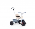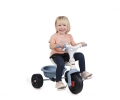 Šlapací tříkolka v modrém provedení má kovový rám, odnímatelnou a nastavitelnou vodící tyč, protiskluzové pedály s možností zablokování šlapání, nastavitelné ergonomické sedadlo na 2 pozice, bezpečnostní pás, výklopný plastový košík.