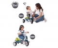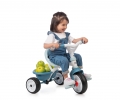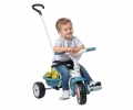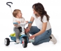 Šlapací tříkolka v modré barvě má kovový rám, nastavitelnou a odnímatelnou vodící tyč (3 výškové úrovně, max. 95 cm), protiskluzové pedály s možností zablokování šlapání, nastavitelné ergonomické sedadlo na 2 pozice, bezpečnostní pás, výklopný plastový košík a tichá kolečka.