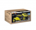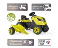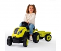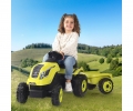 Šlapací traktor s volantem a přívěsným vozíkem, který lze odpojit. Odklápěcí kryt motoru.