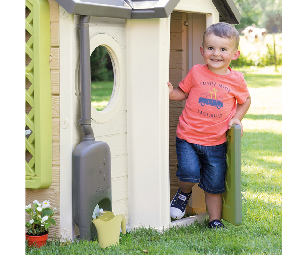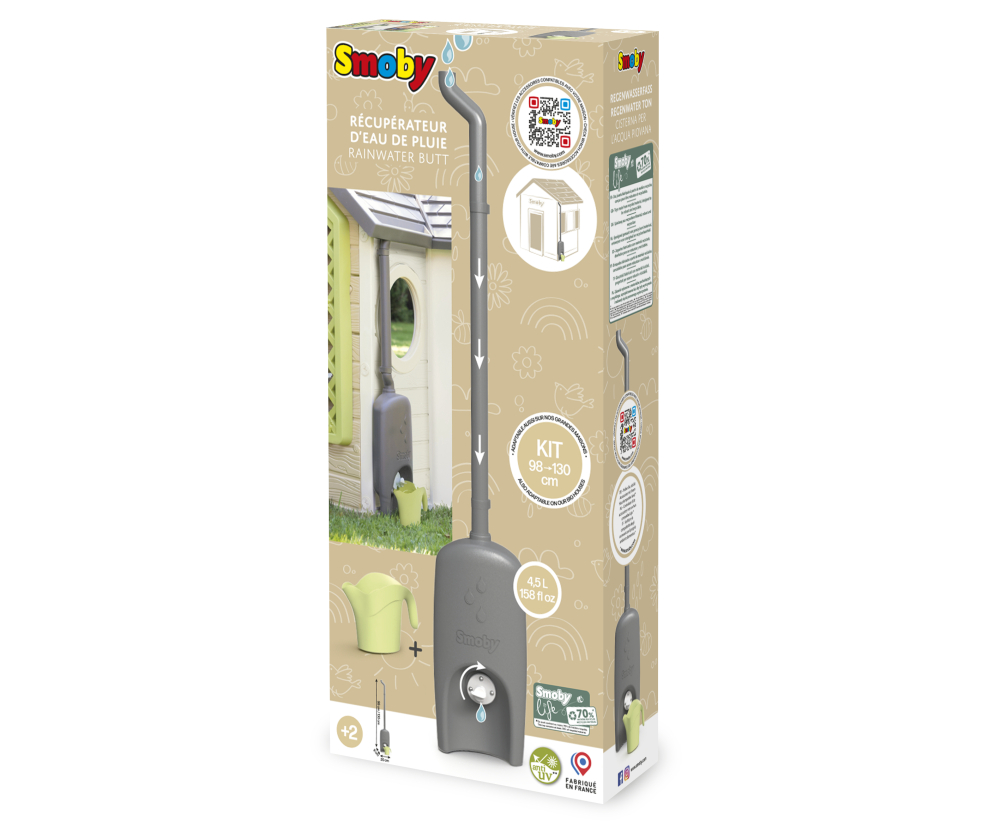 Okap s nádrží na dešťovou vodu s konvičkou jako doplněk pro vybrané domečky Smoby Life. Nádrž na vodu (4,5 l) se velmi snadno instaluje a dešťová voda se pak shromažďuje odvodňovacím žlabem. Pomocí velkého, praktického šroubového ventilu mohou děti nalít vodu do konve a používat ji k zavlažování.